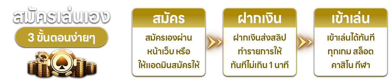 ตอบ : - สมัครผ่านหน้าเว็บไซต์หลัก กรอกข้อมูลส่วนตัวและบัญชีธนาคาร รอรับ username/password ภายใน 3 นาที เริ่มเดิมพันได้ทันที