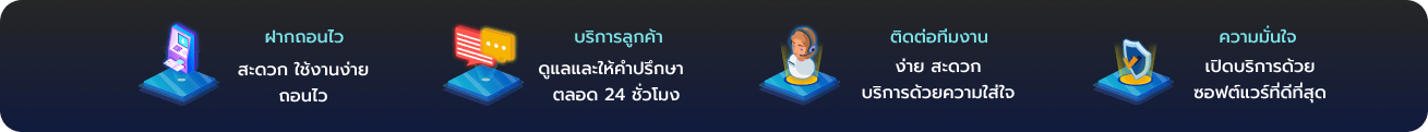 เริ่มต้นจากระบบฝาก-ถอนที่รวดเร็วทันใจ ใช้เวลาไม่เกิน 30 วินาทีในการทำรายการ ไม่ว่าจะเป็นการฝากหรือถอนเงิน ระบบทำงานอัตโนมัติตลอด 24 ชั่วโมง ไม่มีขั้นต่ำในการฝาก และถอนได้ไม่จำกัดจำนวนครั้ง ที่สำคัญรองรับทุกธนาคารชั้นนำในไทย